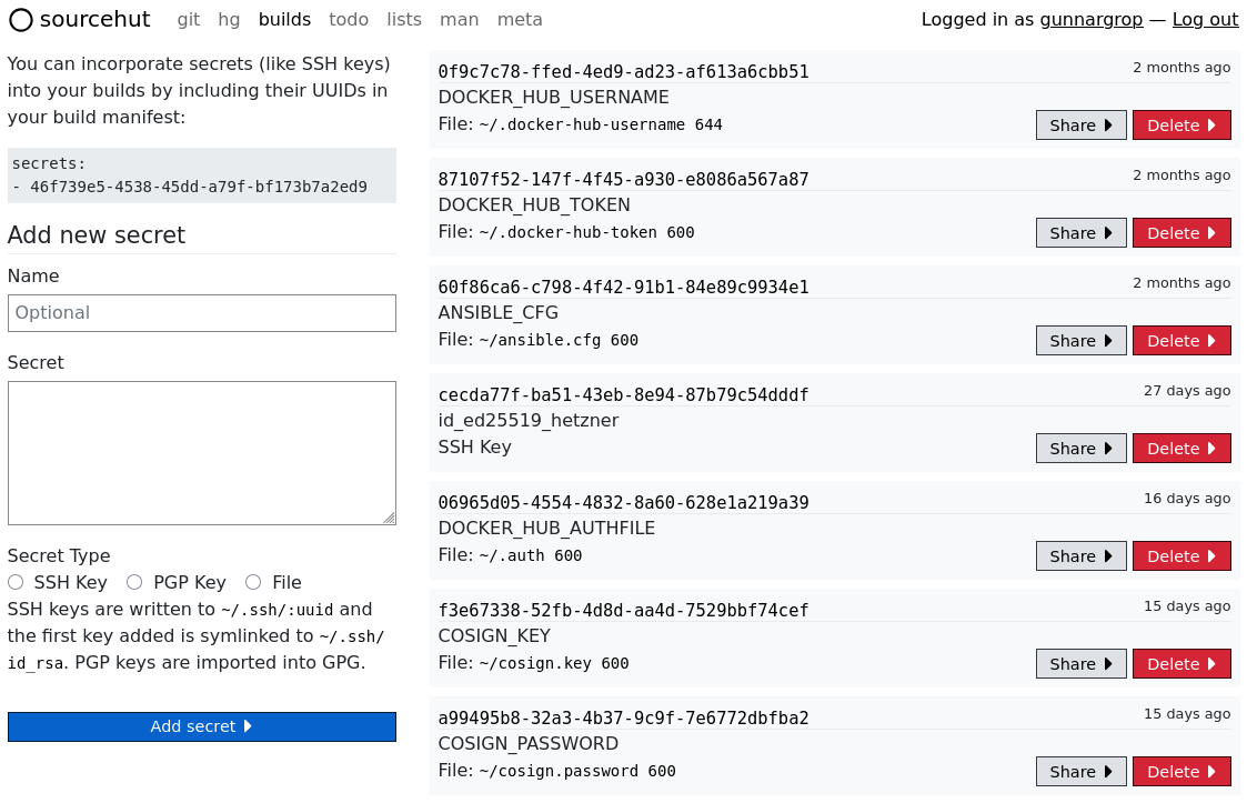 Now that we have our sigstore keys and out authfile, we need to create three different secrets in sourcehut, that we’ll use in our pipeline.