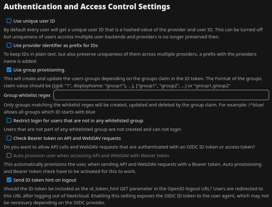 Note: Do not tick the “Use unique user ID” box. This will also make it so that every group name that comes from authentik is hashed in Nextcloud, which will also apply to the “admin” group. I.e, this will break the ability for any authentik user to become admin.