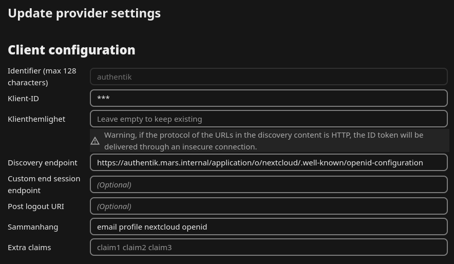 - Discovery Endpoint: “https://authentik.example.com/application/o/nextcloud/.well-known/openid-configuration”